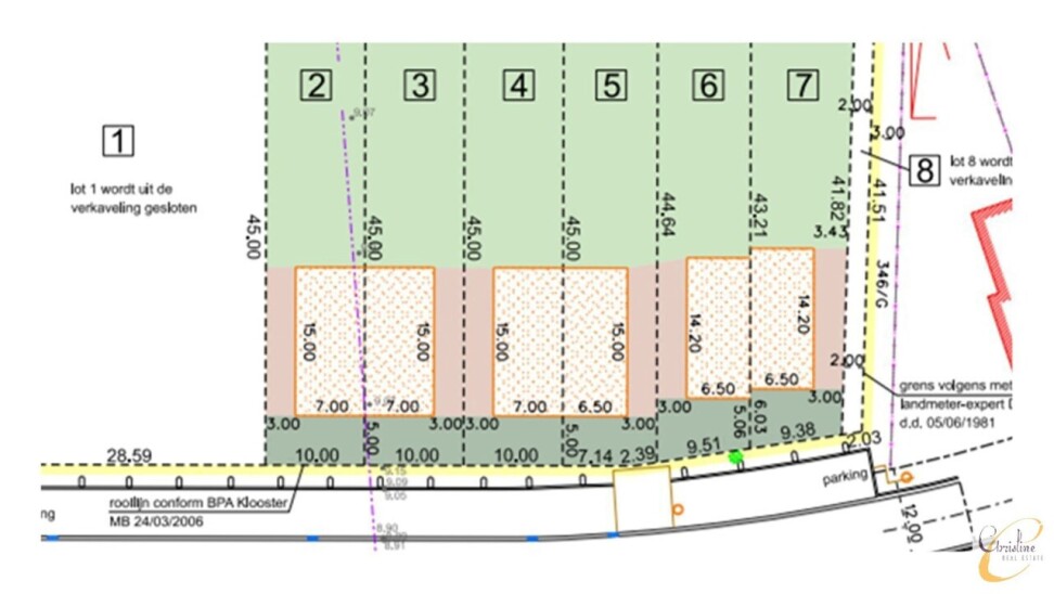 Bouwzone : minimaal 5,00 m vanaf de voorste perceelgrens - Bouwdiepte : 15,00 m op het gelijkvloers / 12,00 m op de verdieping - Zijtuinstrook : 3,00 m - Lot 9 blijft parkzone